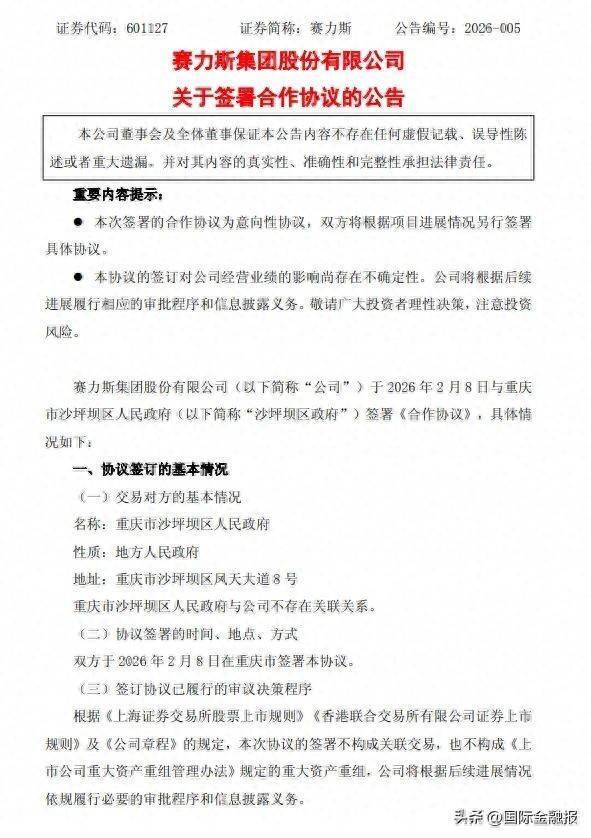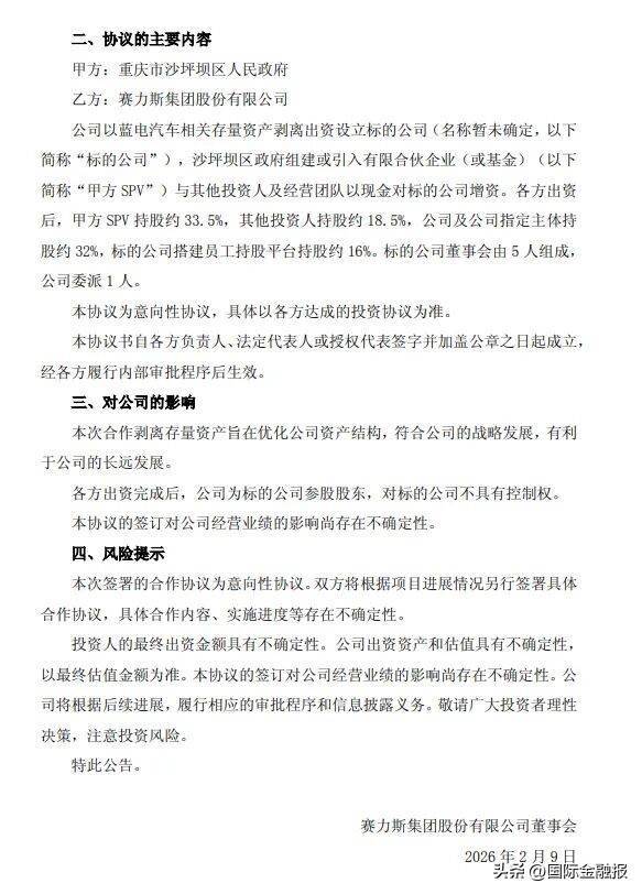 2月8日,赛力斯集团股份有限公司(下称“赛力斯”)发布公告,宣布与重庆市沙坪坝区人民政府签署《合作协议》,计划剥离蓝电汽车相关存量资产,通过出资设立标的公司,引入沙坪坝区政府相关方、其他投资人和经营团队现金增资。